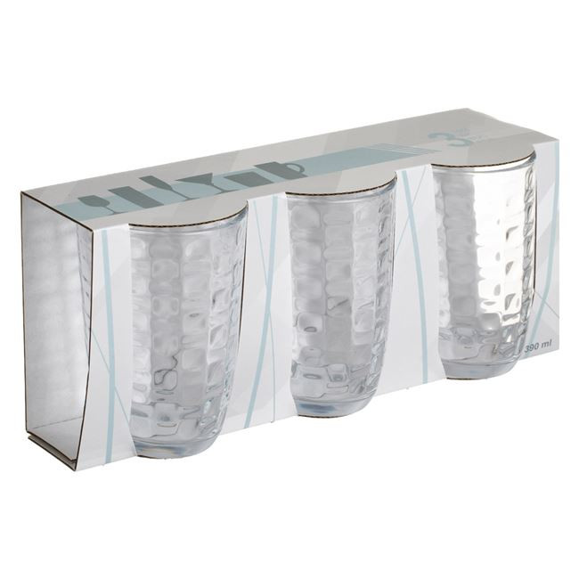 Vigyen eleganciát az asztalára ezzel a 3 darabos átlátszó üvegpohár készlettel. A poharak különleges megjelenését az enyhén lekerekített talp és a modern, dombornyomott méhsejt minta kölcsönzi, amely nemcsak esztétikus, hanem kényelmes fogást is biztosít.