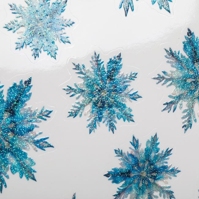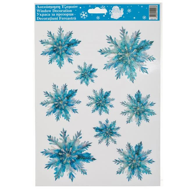 Karácsonyi dekorációs matricák hópehely mintával, ezüst és kék csillogással, tökéletesen ragaszthatók ablakokra, tükrökre vagy bármilyen sima felületre. A fény visszaverődik rajtuk, így varázslatos téli hangulatot teremtenek otthonodban.