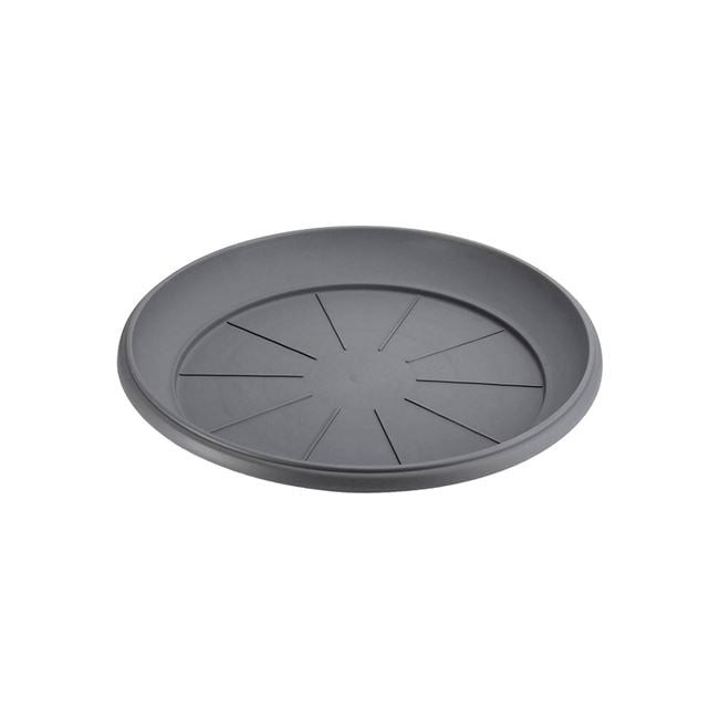 Elegáns, antracit szürke színű műanyag alátét virágcseréphez, amely praktikus megoldást nyújt a felesleges öntözővíz felfogására, így megóvja környezetét a nedvességtől.
