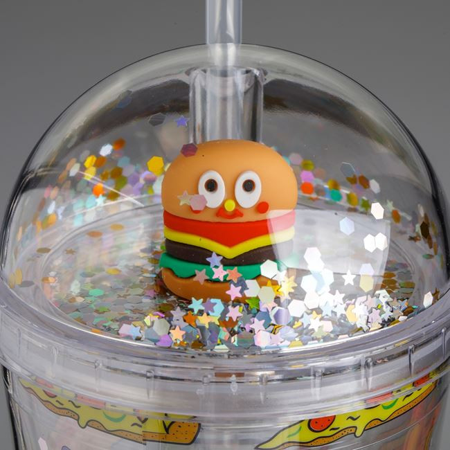 Stílusos, duplafalú műanyag pohár csavaros rögzítésű dóm tetővel és újrafelhasználható átlátszó szívószállal. A poharat színes, gyorsételeket ábrázoló minták díszítik (pizza, hamburger, hot-dog, sült krumpli), az átlátszó dóm belső részében pedig egy mókás hamburger figura található.