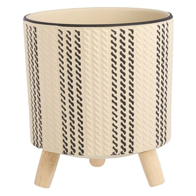 Stílusos bézs kerámia kaspó, amelyet függőlegesen futó, dombornyomott fekete csíkok és fekete perem tesz különlegessé. Az edény három stabil, csavarral rögzíthető fa lábon áll, amely modern és természetes megjelenést kölcsönöz neki.