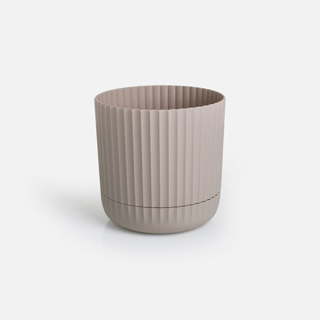 Elegáns, kerek formájú, mokka bézs színű műanyag virágcserép, amely stílusos függőleges bordázott mintával díszített a teljes felületén. A cserép praktikus, beépített alátéttel rendelkezik, így a felesleges víz elvezetése és gyűjtése esztétikusan megoldott.