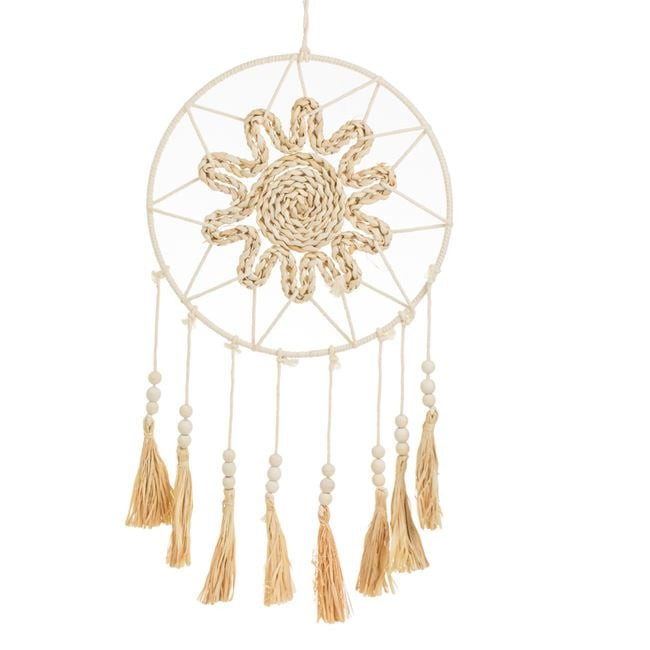 Varázsoljon különleges hangulatot hálószobájába ezzel a gyönyörű, dekoratív krém színű álomfogóval. Az aprólékos kézimunkával készült dísztárgyat elegáns szalma virágminta, lágy rojtok és természetes fagyöngyök teszik teljessé.