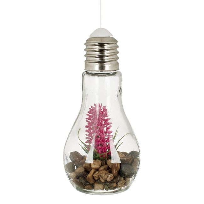 Varázsoljon meghitt hangulatot otthonába ezzel az elegáns, átlátszó üvegből készült dekoratív LED-es lámpával. A vízcsepp formájú üvegbúra belsejében stílusos barna díszkövek és egy élénk fukszia színű virág található, amelyeket a beépített LED fény világít meg, különleges esztétikai élményt nyújtva.