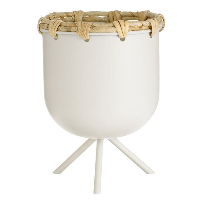 Varázsolja különlegessé otthonát ezzel az elegáns, ecru színű fémes kaspóval, amely természetes szalmafonat díszítéssel és három stabil fém lábbal rendelkezik.