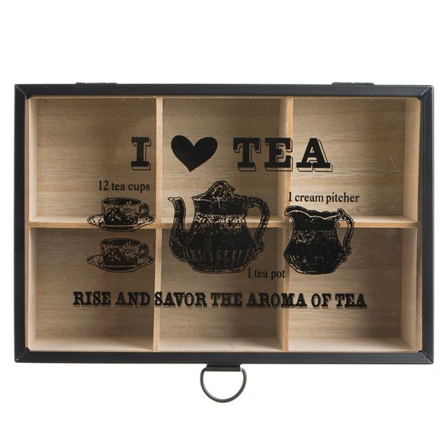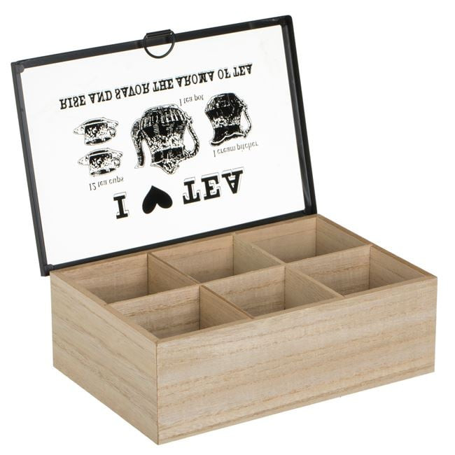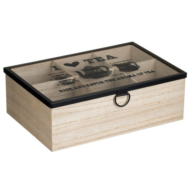 Rendszerezze kedvenc teáit stílusosan ebben az elegáns, 6 rekeszes fából készült teadobozban. A természetes fa alapanyag és az átlátszó üvegfedél nemcsak praktikus tárolást tesz lehetővé, hanem modern, mégis rusztikus dísze lehet konyhájának vagy étkezőjének.