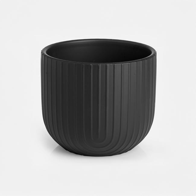 Stílusos, matrefényű fekete kerámia kaspó különleges dombornyomott mintával, amely eleganciát kölcsönöz bármely helyiségnek.