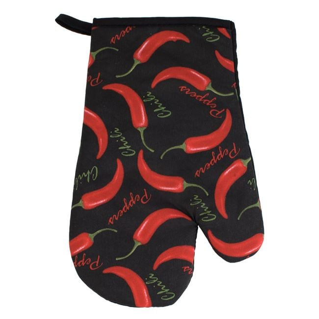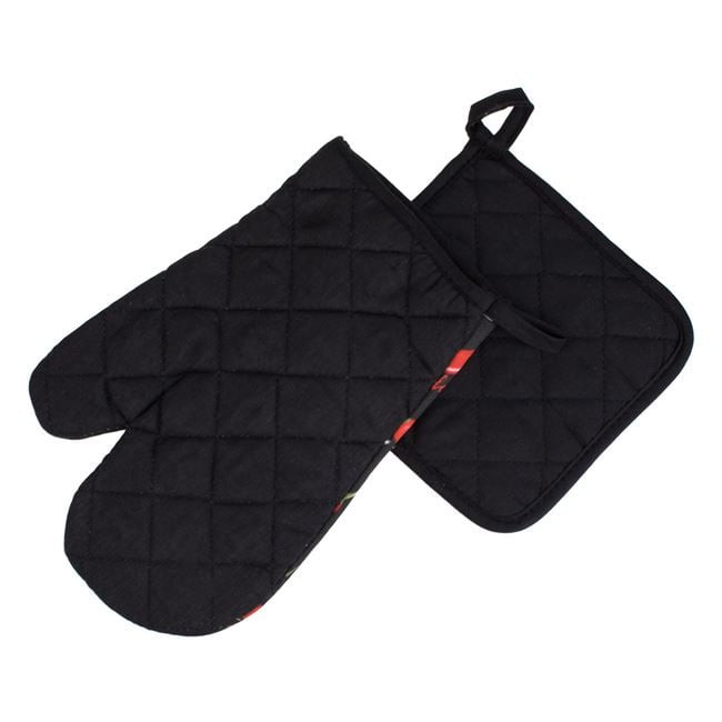 Tegye stílusossá és biztonságossá a sütés-főzést ezzel a praktikus konyhai szettel! A csomag egy konyhai kesztyűt és egy edényfogó kendőt tartalmaz, mindkettő elegáns fekete alapszínben, vibráló piros chili paprika mintával díszítve.