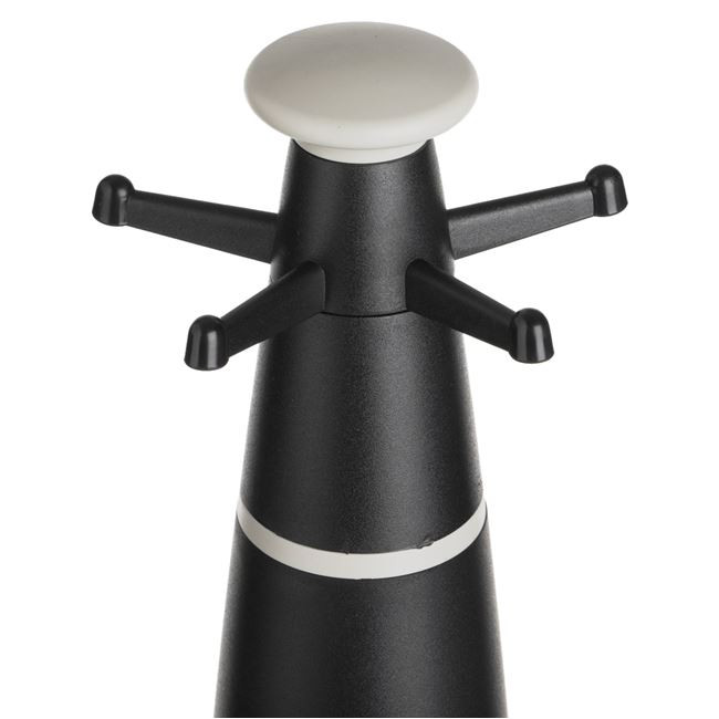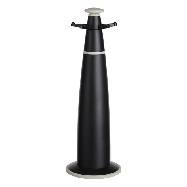 Rendszerezze konyháját stílusosan ezzel a praktikus, kúp alakú fekete műanyag konyhai eszköztartóval, amelyet elegáns krém színű részletek díszítenek. A tartó 5 darab stabil kampóval rendelkezik, amelyek ideálisak főzőkanalak, merőkanalak és egyéb konyhai kiegészítők tárolására, amennyiben azok nyelén akasztónyílás vagy gyűrű található.