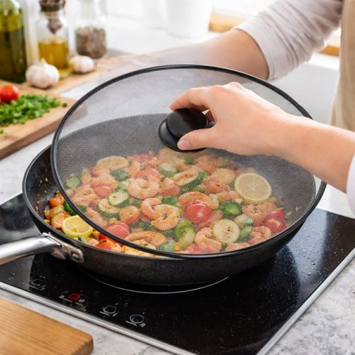 Praktikus, fekete színű kerek szita, amely hatékonyan fedi le a serpenyőt, megakadályozva a forró olaj kifröccsenését a tűzhelyre vagy a ruházatra. Készítse el kedvenc ételeit anélkül, hogy aggódnia kellene az égető olajcseppek miatt.