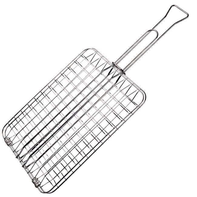 Ez a kompakt, 30x22 cm-es fém grillrács ideális választás húsok, zöldségek vagy halak kényelmes grillezéséhez. A rács vízszintes és függőleges huzalozással készült, így stabilan tartja az ételt, a széleken pedig biztonságosan záródik, megakadályozva a hozzávalók kiesését fordítás közben.