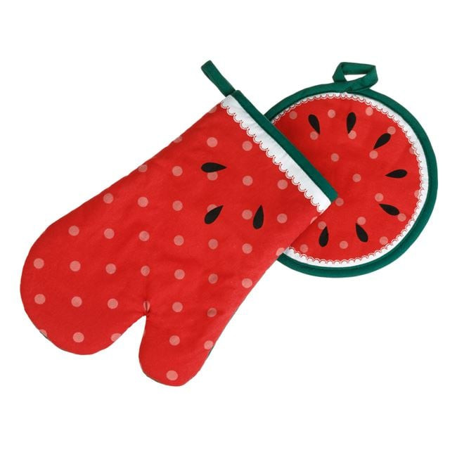 Tegye vidámmá a sütés-főzést ezzel a stílusos, görögdinnye mintás konyhai szettel. A csomag egy hőszigetelt konyhai kesztyűt és egy kerek edényfogó alátétet tartalmaz, melyek élénk piros és zöld színeikkel igazi nyári hangulatot árasztanak a konyhában.