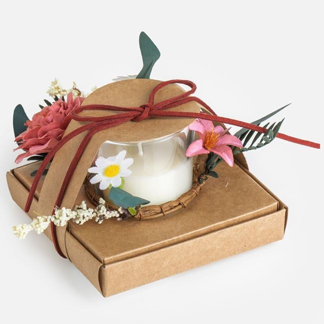 Stílusos dekorációs készlet, amely egy üvegpohárban elhelyezett fehér gyertyát és egy földszínekben pompázó, virágokkal és ágakkal díszített koszorút tartalmaz. A termék esztétikus kartoncsomagolásban érkezik, így ajándéknak is tökéletes választás.