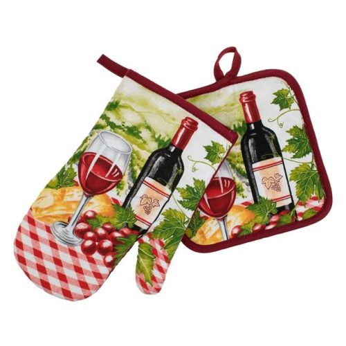 Tegye varázslatossá konyháját ezzel a húsvéti témájú, elegáns konyhai kesztyű (14x26 cm) és edényfogó kendő (18x18 cm) szettel, amelyet stílusos borosüveg és pohár minta díszít.