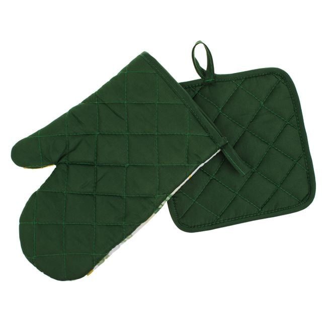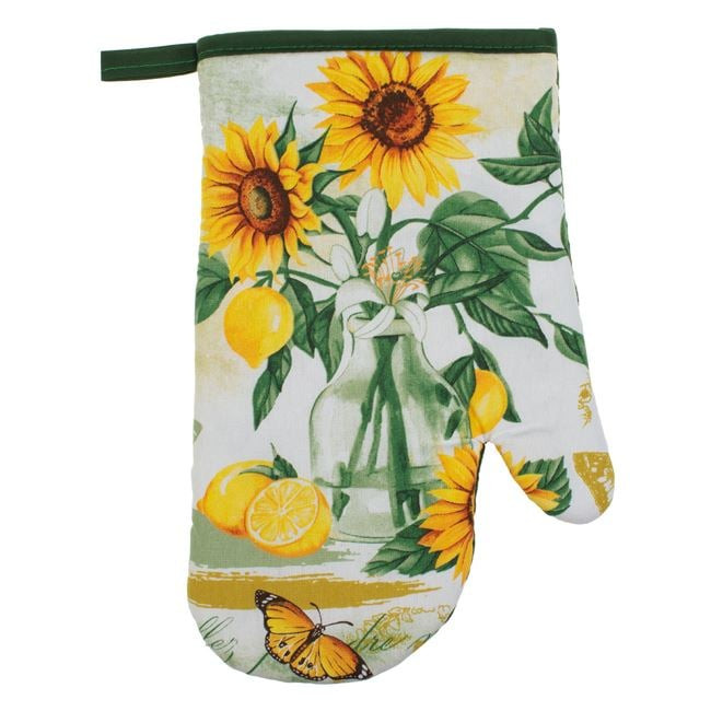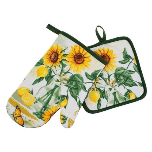 Tegye varázslatossá a húsvéti készülődés pillanatait ezzel az elegáns és praktikus konyhai textilegyüttessel! A szett egy sütőkesztyűt (14x26 cm) és egy edényfogót (18x18 cm) tartalmaz, melyeket hangulatos tavaszi minta díszít: vázába helyezett napraforgók és friss citromok kompozíciója.