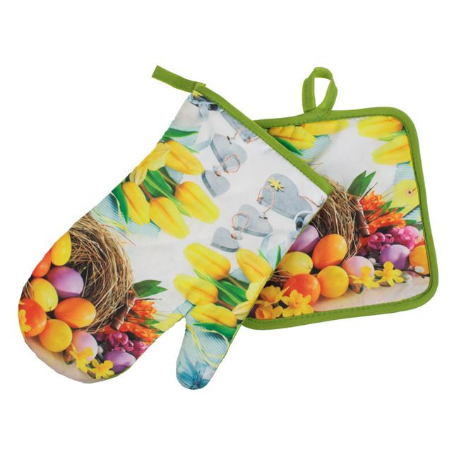 Tegye hangulatossá konyháját ezzel a bájos húsvéti konyhai szettel! A készlet tartalma egy párnázott konyhai kesztyű (14x26 cm) és egy praktikus edényfogó alátét (18x18 cm), melyeket színes hímes tojásokkal teli kosár és vidám sárga tulipánok díszítenek.