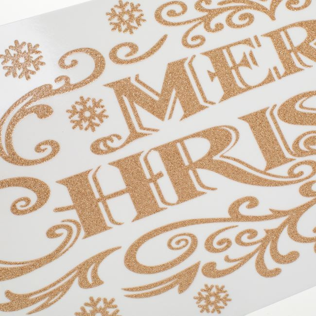 Üvegre ragasztható matrica a „Merry Christmas” felirattal, csillámos, bézs–champagne díszítéssel.