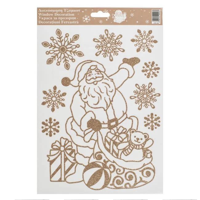 Üvegre ragasztható matrica Mikulással és hópelyhekkel, csillámos bézs–champagne díszítéssel.