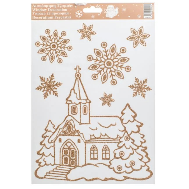 Üvegre ragasztható matrica templommal és hópelyhekkel, csillámos bézs–champagne díszítéssel.