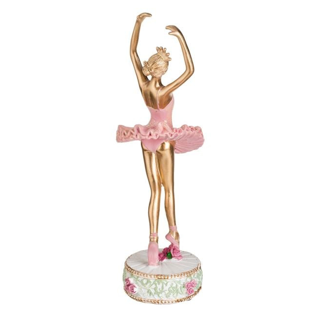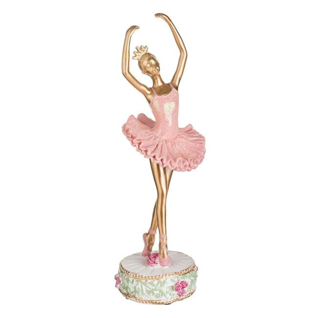 Karácsonyi polirezineből készült dekoráció, aranyszínű balerina rózsaszín szoknyával, vintage stílusú talapzaton.