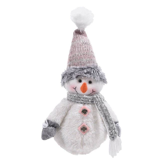 Karácsonyi dekoráció, hóember ecru színű műszőrme kabátban nagy gombokkal, kötött rózsaszín sapkával és szürke sállal.