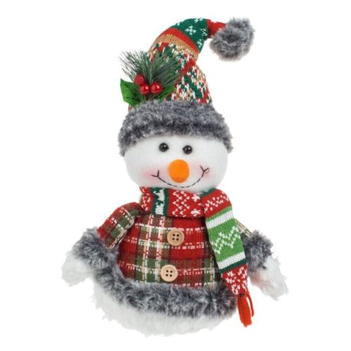 Karácsonyi dekoráció, hóember fehér színű testtel, jacquard sapkával (fonott mintával) piros, zöld és barna színekkel, szürke műszőrme bojttal, zöld és piros bogyós fagyönggyel, piros-zöld jacquard sállal, piros-zöld kockás kabáttal, barna fa gombokkal és fehér-szürke műszőrme részletekkel az ujjakon és az alján.
