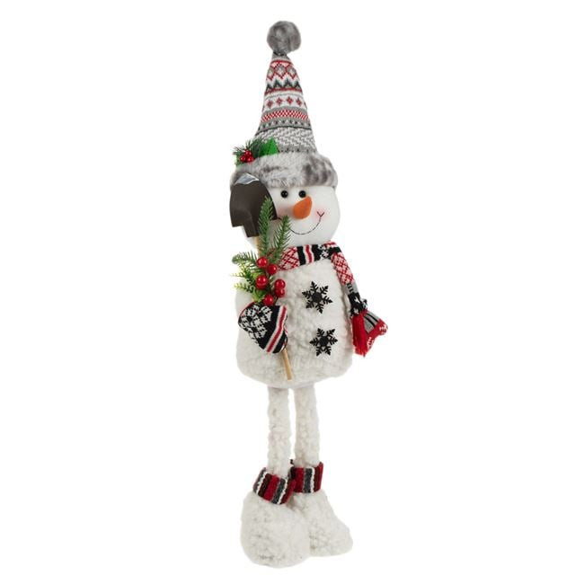 Karácsonyi dekorációs figura, fehér hóember szürke kötött sapkával, piros és kék sállal, hozzáillő kesztyűvel. Magas, fémlábakkal rendelkezik, kezében lapátot és bogyókat tart.