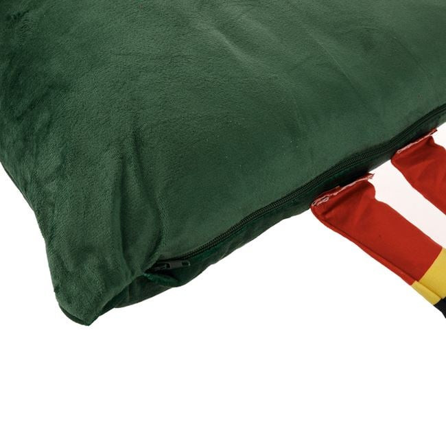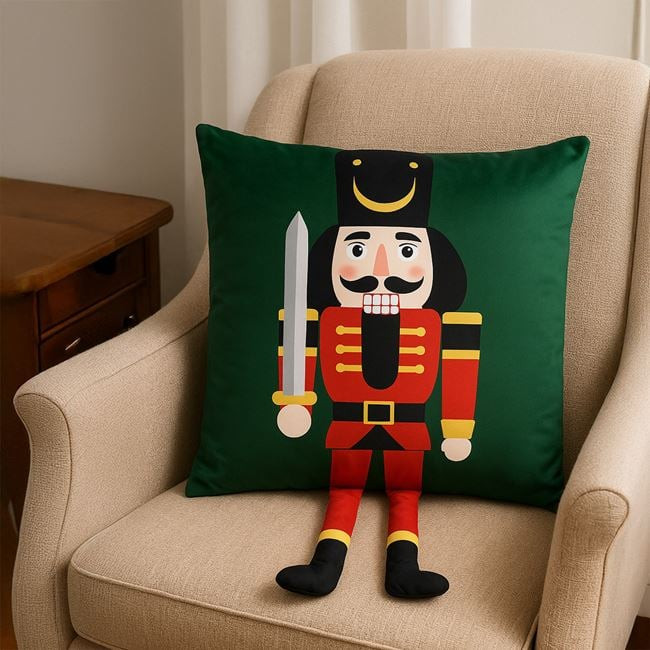 Zöld, bársonyos tapintású kanapépárna, egyoldalas mintával, cipzárral, diótörő figurával és 15 cm-es 3D lábakkal, amelyek kiemelkednek a párnából. Hangulatos ünnepi dekoráció, amely különleges karaktert ad az otthonodnak.