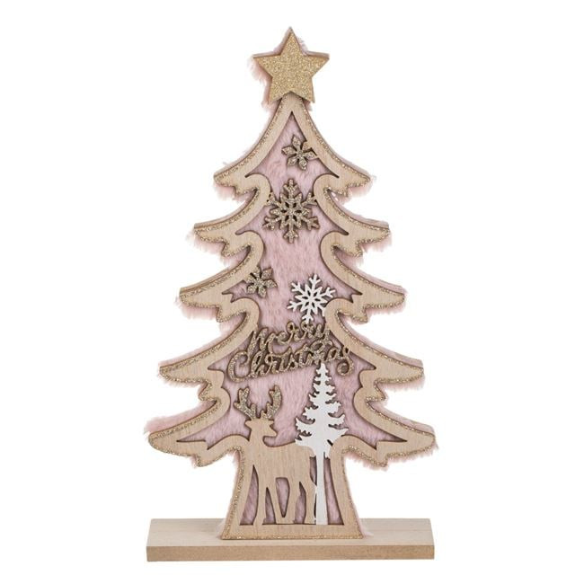 Világos rózsaszín műszőrmével díszített fa karácsonyi dekoráció talppal, pezsgő-bézs glitteres hópelyhekkel és csillagokkal, valamint egy aranyos rénszarvas figurával és „Merry Christmas” felirattal. Elegáns és ünnepi kiegészítő bármely helyiségbe, tökéletes a karácsonyi hangulat megteremtéséhez.