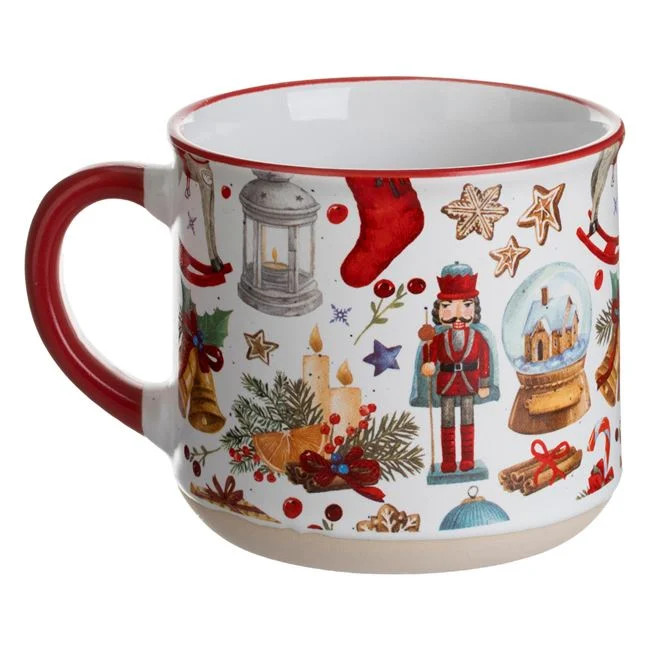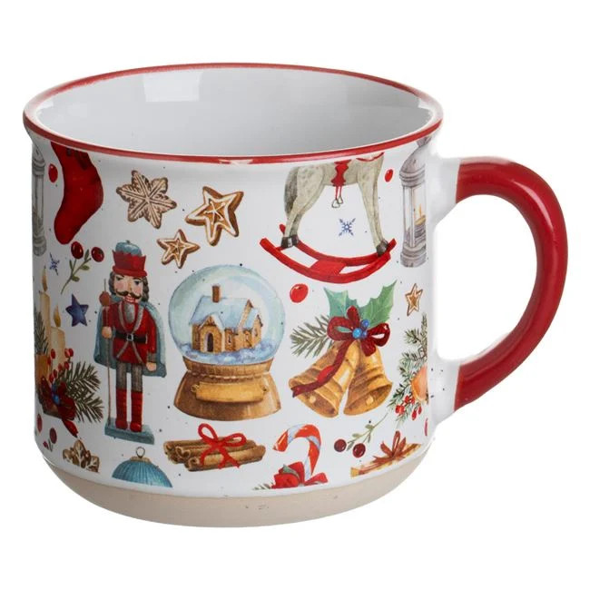 Karácsonyi kerámia bögre, egyenes formájú, fehér matt felülettel, piros szegéllyel és fogantyúval, dekorálva gyermekjátékokkal és diótörő figurákkal.