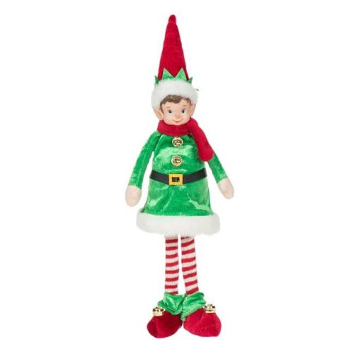 Karácsonyi dekoráció, tündér piros sapkával és sállal, zöld kabát csengőkkel, hosszú lábakkal, álló figura.