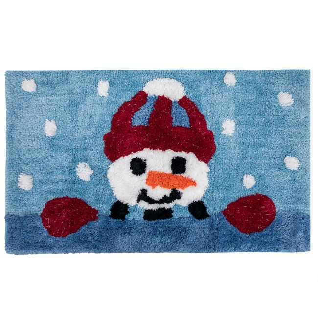 Karácsonyi dekorációs fürdőszobai szőnyeg kék színben, hóember mintával és ezüst lurex részletekkel. Az alsó része különleges, csúszásgátló anyagból készült.