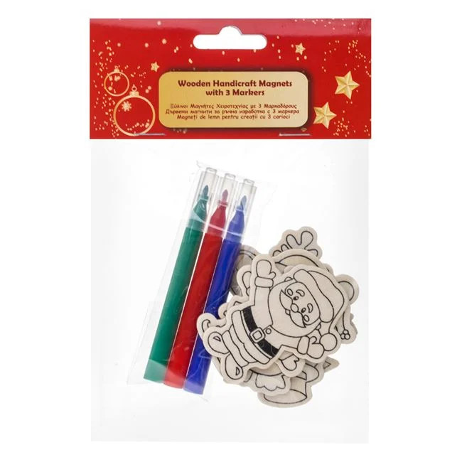Karácsonyi kreatív készlet fa figurákkal, mágneses hátlappal: rénszarvas, karácsonyfa, pingvin, manó, Mikulás és hóember. A csomag 3 darab mini filctollat is tartalmaz a rajzoláshoz.