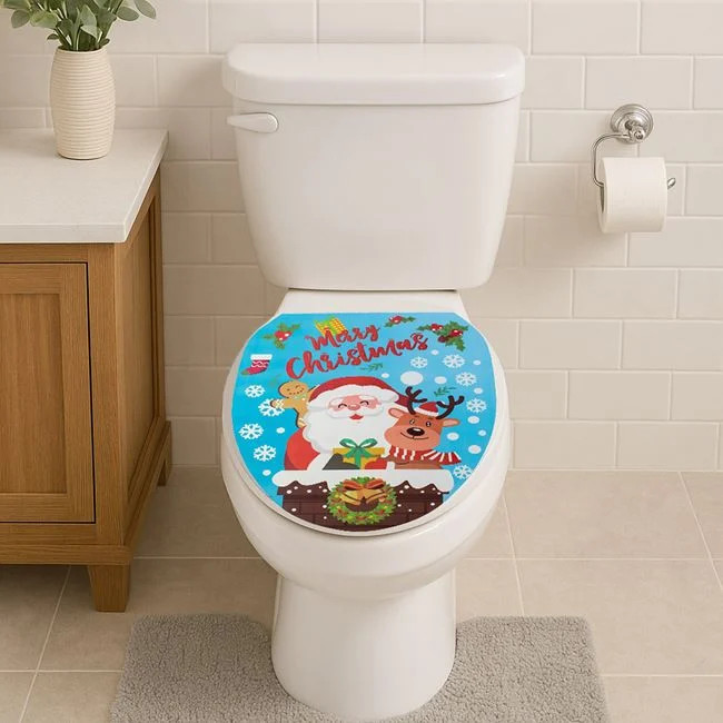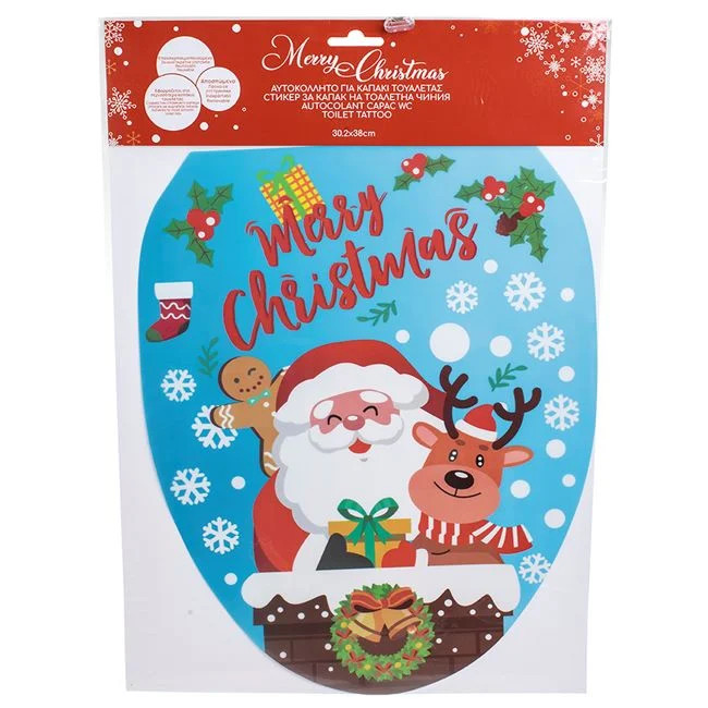 Karácsonyi matrica a WC-ülőke fedeléhez, Mikulás és rénszarvas figurákkal, „Merry Christmas” felirattal. Levehető és újrahasználható.