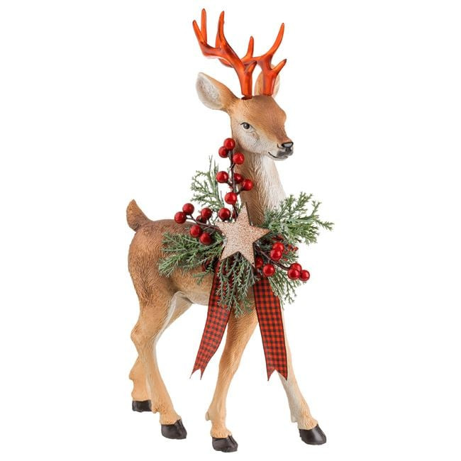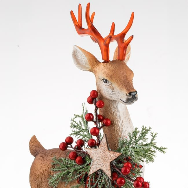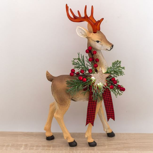 Karácsonyi asztali dekorfigura, élethű bundarészletekkel, agancsokkal és arcvonásokkal. A szarvas nyakán bogyós ággal, kockás szalaggal kötött csillaggal és finoman körbefűzött LED-fényekkel díszítve. 3 db LR44 elemmel működik (tartozék).
