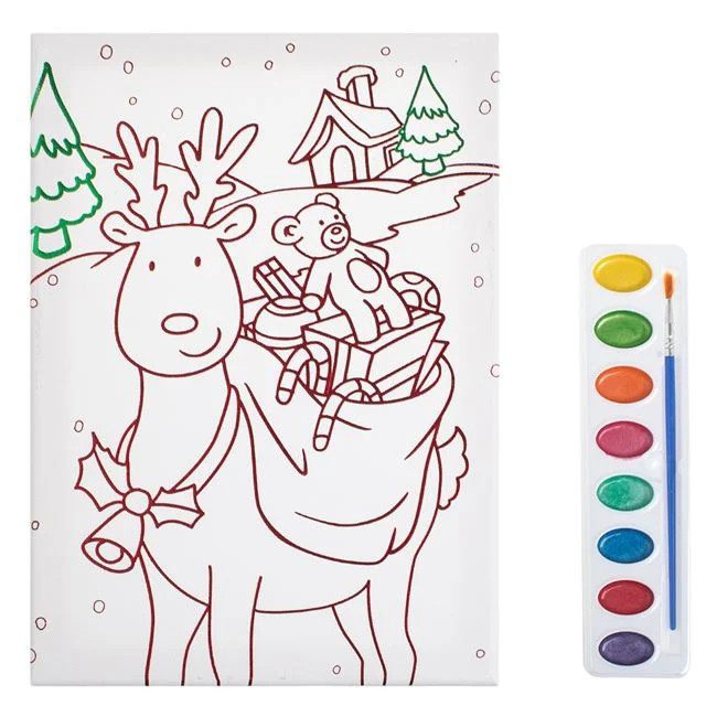 Karácsonyi színező készlet A4 méretű vászonnal, ajándékos rénszarvas mintával. A csomag tartalma: 1 db festővászon, 1 db akvarellfesték-paletta (lila, fukszia, világoskék, smaragdzöld, rózsaszín, narancs, zöld és sárga színekben) és 1 db ecset. A vászon tökéletes akvarellfestékkel és akvarellceruzával való festéshez.
