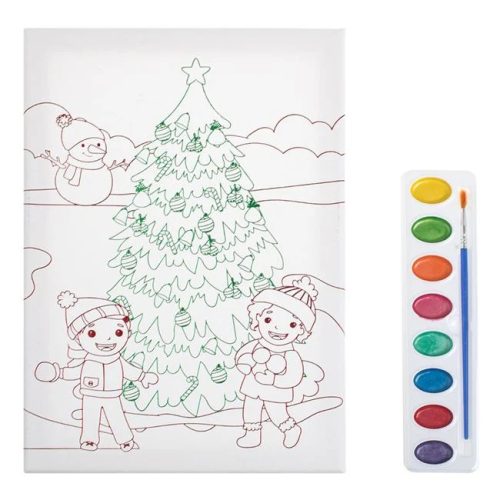 Karácsonyi színező készlet A4 méretű vászonnal, fenyőfa és gyerekek mintával. A csomag tartalma: 1 db festővászon, 1 db akvarellfesték-paletta (lila, fukszia, világoskék, smaragdzöld, rózsaszín, narancs, zöld és sárga színekben) és 1 db ecset. A vászon tökéletes akvarellfestékkel és akvarellceruzával történő festéshez.