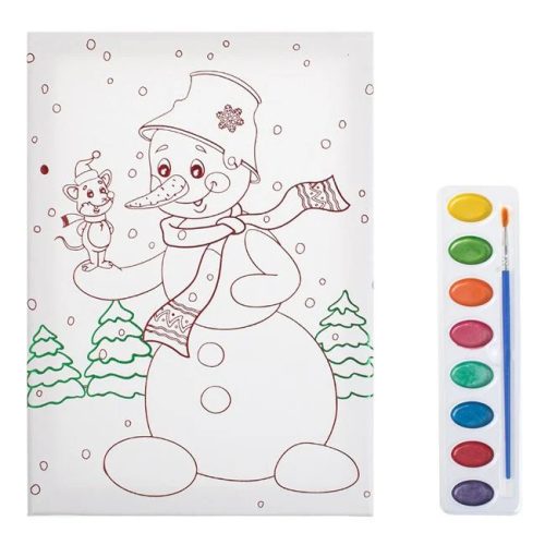 Karácsonyi színező készlet A4 méretű vászonnal, hóember és egér mintával. A csomag tartalma: 1 db festővászon, 1 db akvarellfesték-paletta (lila, fukszia, világoskék, smaragdzöld, rózsaszín, narancs, zöld és sárga színekben) és 1 db ecset. A vászon tökéletes akvarellfestékkel és akvarellceruzával való festéshez.