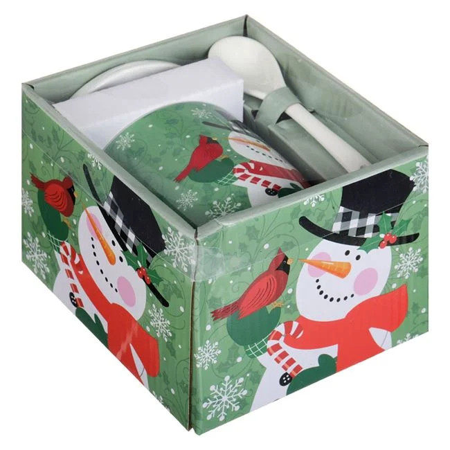 Karácsonyi porcelán bögre szett, zöld színben, hóember és piros madár mintával. Tartalmaz egy 10 cm-es fedelet és egy 12 cm-es fehér kanalat.