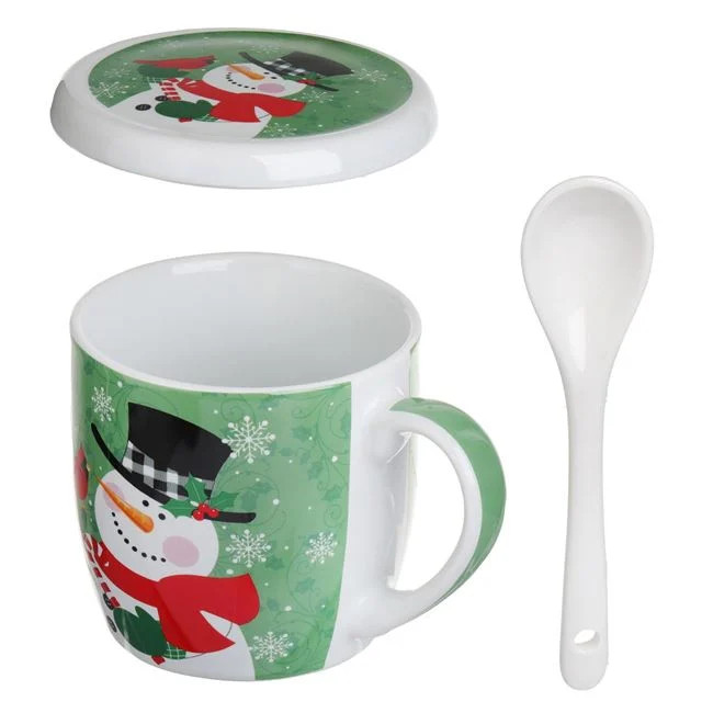 Karácsonyi bögre szett fedéllel és kanállal – hóember mintával