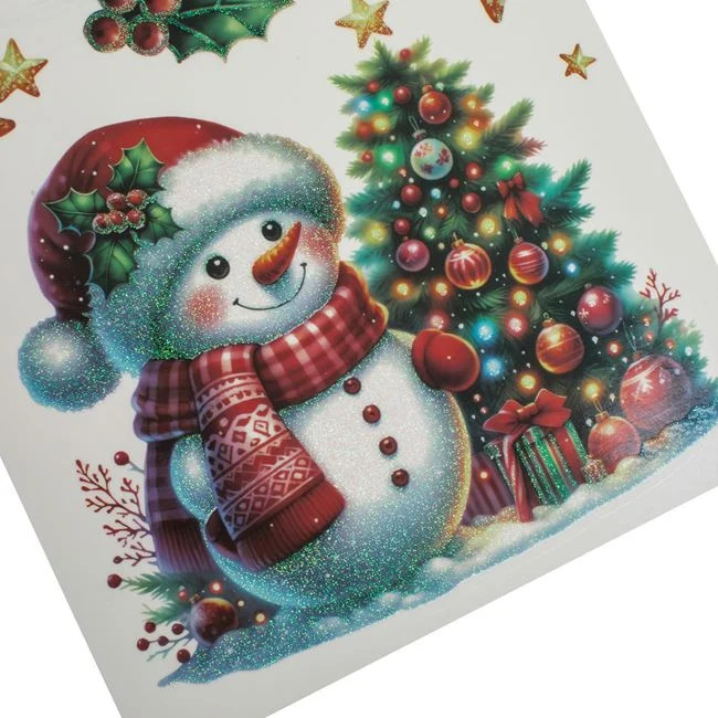Üvegmatrica díszített karácsonyfával, hóemberrel, fagyönggyel és holografikus csillogó részletekkel.