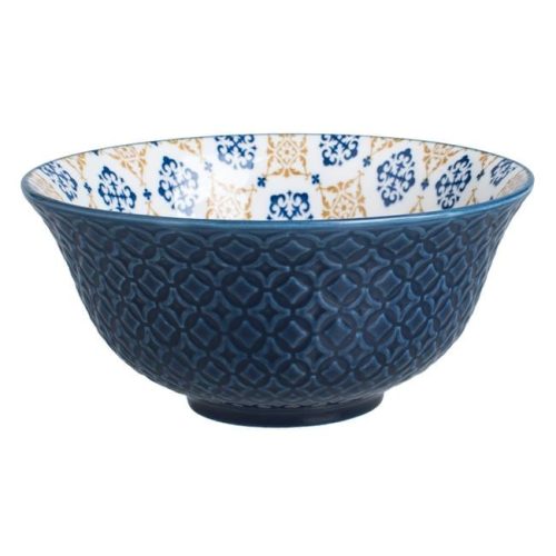 Kiváló minőségű porcelánból készült tálalótál, melynek kék külsejét dombornyomott rombuszminta díszíti, belsejét pedig elegáns kék és barna motívumok teszik különlegessé.