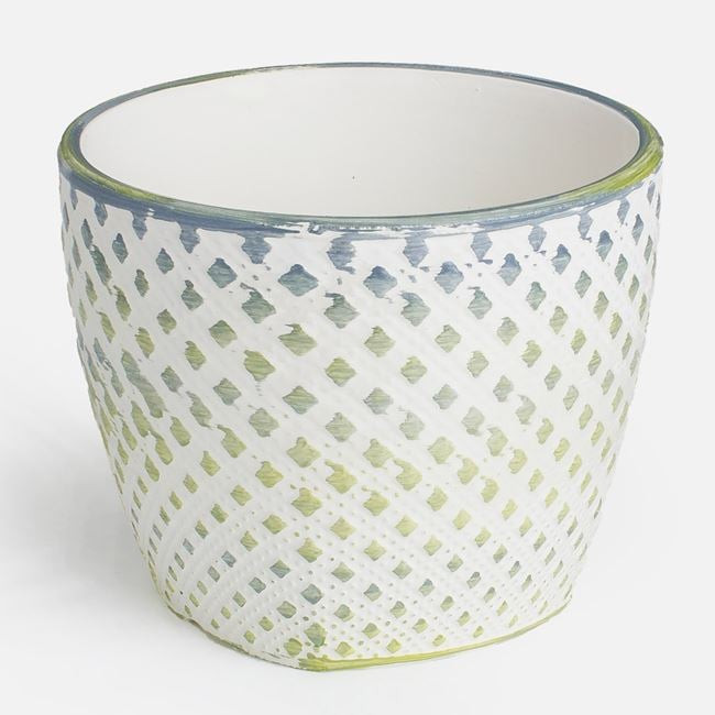 Varázsolja különlegessé otthonát ezzel a stílusos, kerámiából készült kaspóval. A kaspó elegáns fehér alapszínét élénk lime zöld árnyalat egészíti ki, felületét pedig modern, dombornyomott rombusz minta díszíti.