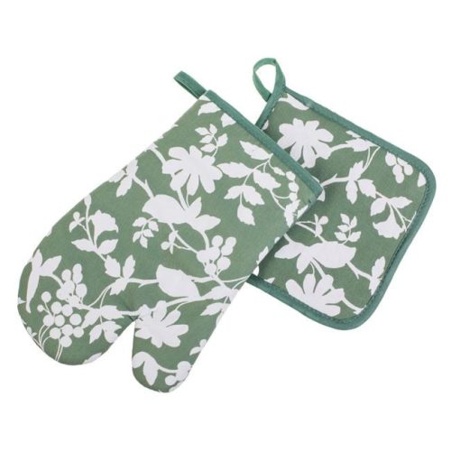 Tegye stílusossá és biztonságossá a sütés-főzést ezzel az esztétikus, zöld-fehér virágmintás konyhai szettel. A készlet egy hőszigetelő konyhai kesztyűt és egy praktikus edényfogót tartalmaz, amelyek nemcsak hasznos kiegészítői a konyhának, hanem dekoratív megjelenésükkel a helyiség hangulatát is feldobják.