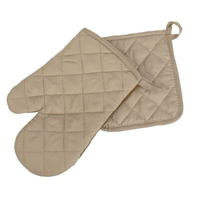 Stílusos és praktikus konyhai szett taupe szürke színben, amely dekoratív és hasznos kiegészítője minden modern konyhának. A szett egy darab edényfogó kesztyűt és egy darab négyzet alakú edényfogó kendőt tartalmaz, melyek hatékony védelmet nyújtanak a forró edények mozgatása közben.