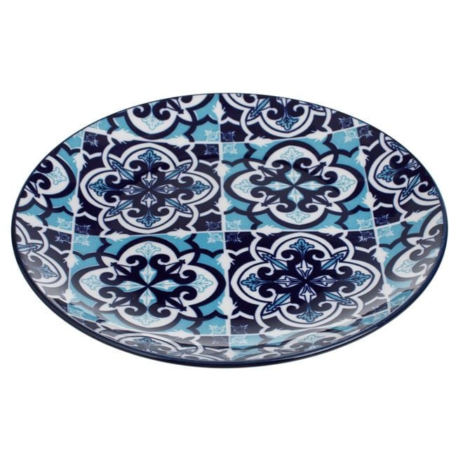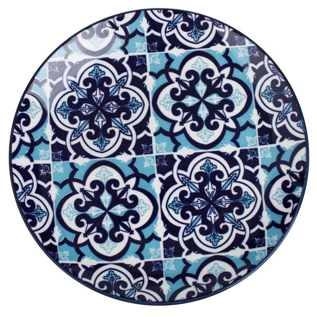 Stílusos, kék színű azték mintás lapostányér, amely egyedi megjelenést kölcsönöz az étkezéseknek. Ez a prémium minőségű porcelán tálalótányér ideális választás mindennapi használatra vagy ünnepi alkalmakra egyaránt.