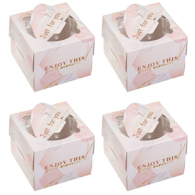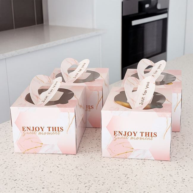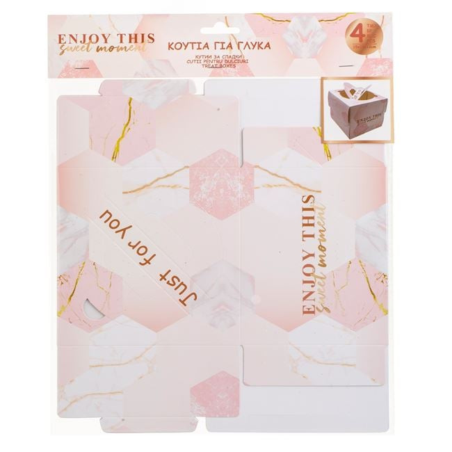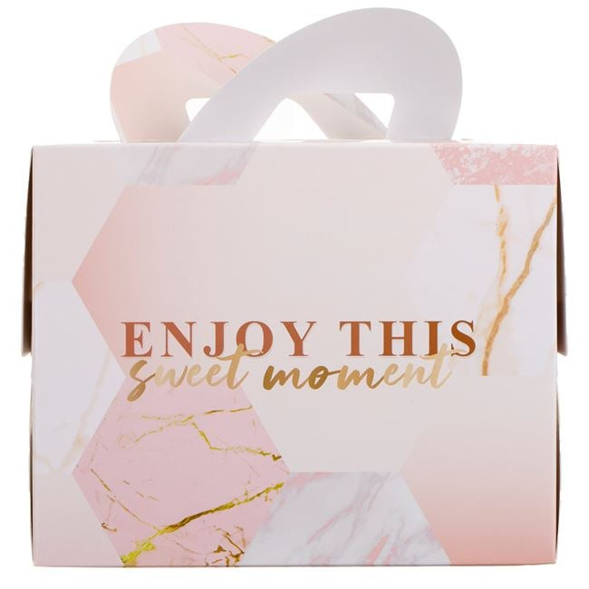 Elegáns, márványmintás rózsaszín édességes dobozok, amelyek tökéletesek sütemények, fánkok vagy más finomságok stílusos csomagolásához. A dobozokon az esztétikus „Enjoy this sweet moment” felirat olvasható, így ideálisak ajándékozáshoz, esküvőkre vagy különleges alkalmakra.