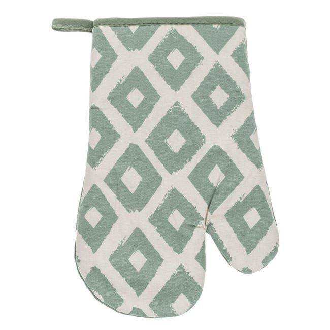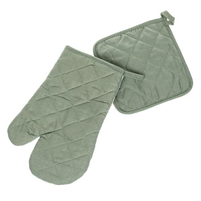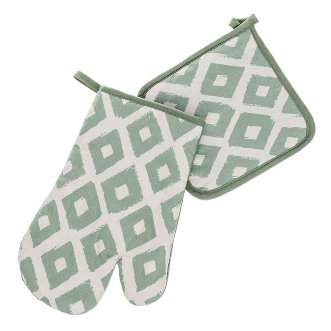 Tegye stílusossá és biztonságossá a sütés-főzést ezzel a prémium megjelenésű, menta zöld konyhai szettel. A készlet egy konyhai kesztyűt és egy hozzáillő edényfogót tartalmaz, melyeket elegáns rombusz minta díszít.