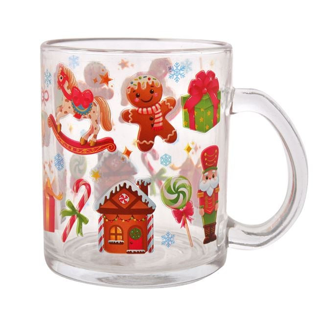 Karácsonyi üvegbögre, átlátszó, egyenes formájú, különféle mézeskalács figurákkal díszítve.