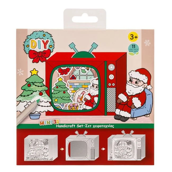 Karácsonyi kreatív készlet, amivel egy kis TV-t készíthetsz, amin Mikulás és egy feldíszített házikó látható. Színezd ki a TV-dobozt, a sablont és a hátteret élénk színekkel (nem tartozék). Rakd össze az összes kiegészítőt és ragaszd őket (ragasztó nem tartozék).